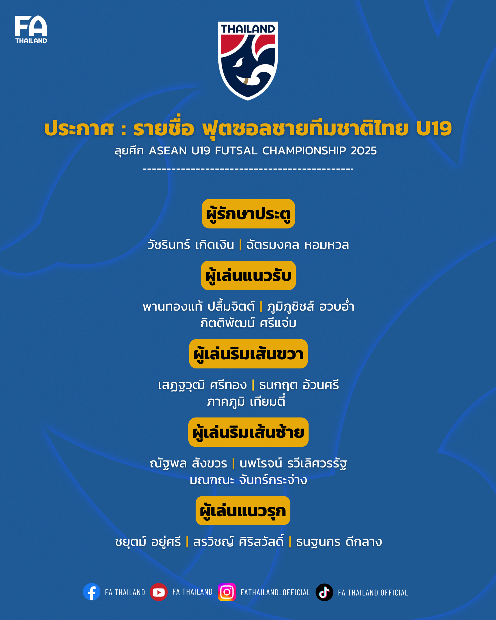 สมาคมกีฬาฟุตบอลแห่งประเทศไทย ในพระบรมราชูปถัมภ์ ประกาศรายชื่อ 14 นักฟุตซอลชายทีมชาติไทย รุ่นอายุไม่เกิน 19 ปี ทำการแข่งขันรายการ ASEAN U19 FUTSAL CHAMPIONSHIP 2025 ระหว่างวันที่ 22-28 ธันวาคม 2568 ณ ยิมเนเซียม อบจ.นนทบุรี
