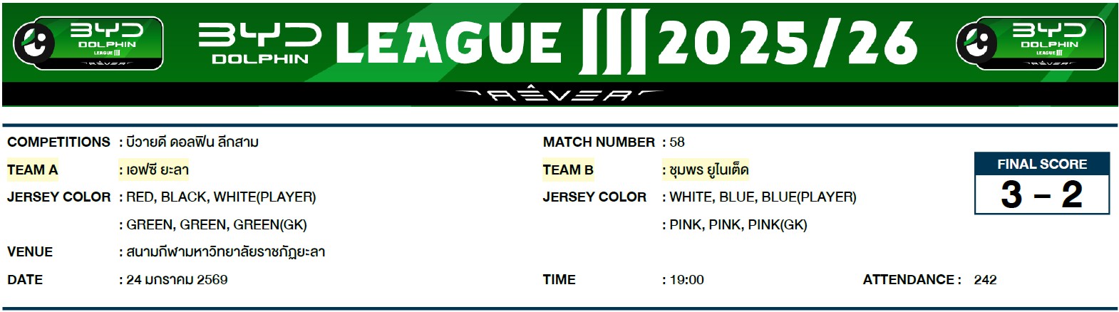 3. การแข่งขันกีฬาฟุตบอลรายการบีวายดี ดอลฟิน ลีกสาม วันที่ 24 มกราคม 2569 คู่ระหว่างสโมสรเอฟซี ยะลา พบ สโมสรชุมพร ยูไนเต็ด