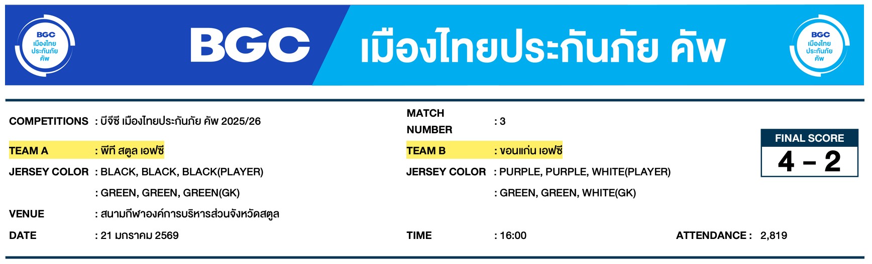 4. การแข่งขันกีฬาฟุตบอลรายการ บีจีซี เมืองไทยประกันภัย คัพ วันที่ 21 มกราคม 2569 คู่ระหว่างสโมสรพีที สตูล เอฟซี พบ สโมสรขอนแก่น เอฟซี