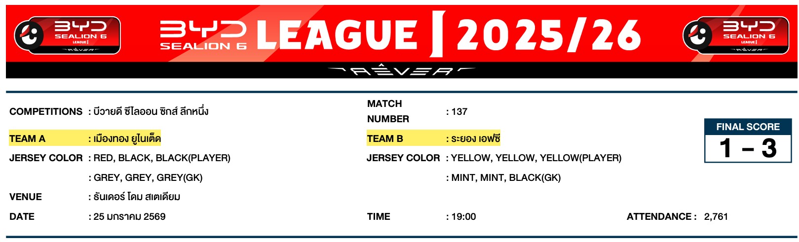 1. การแข่งขันกีฬาฟุตบอลรายการบีวายดี ซีไลออน ซิกส์ ลีกหนึ่ง วันที่ 25 มกราคม 2569 คู่ระหว่างสโมสรเมืองทอง ยูไนเต็ด พบ สโมสรระยอง เอฟซี