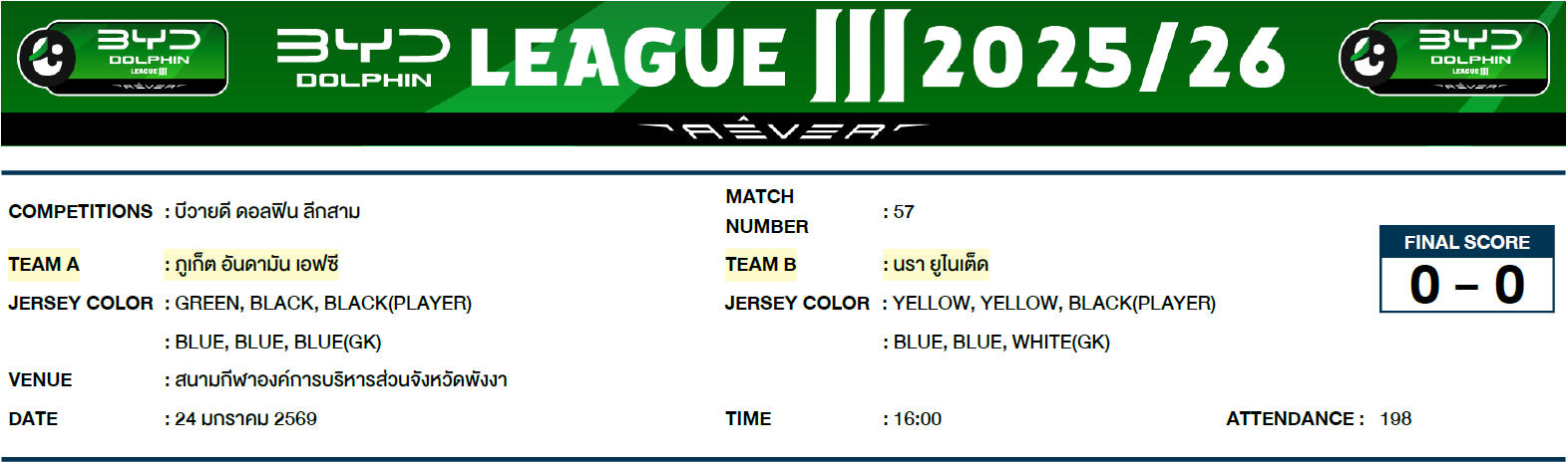 2. การแข่งขันกีฬาฟุตบอลรายการบีวายดี ดอลฟิน ลีกสาม วันที่ 24 มกราคม 2569 คู่ระหว่างสโมสรภูเก็ต อันดามัน เอฟซี พบ สโมสรนรา ยูไนเต็ด