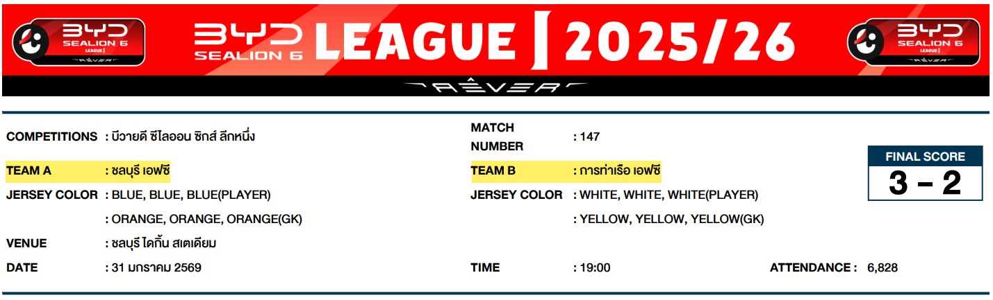 1. การแข่งขันกีฬาฟุตบอลลีกอาชีพรายการบีวายดี ซีไลออน ซิกส์ ลีกหนึ่ง วันที่ 31 มกราคม 2569 คู่ระหว่างสโมสรชลบุรี เอฟซี พบ สโมสรการท่าเรือ เอฟซี (สโมสรการท่าเรือ เอฟซี ร้องเรียนมา 1 เหตุการณ์)