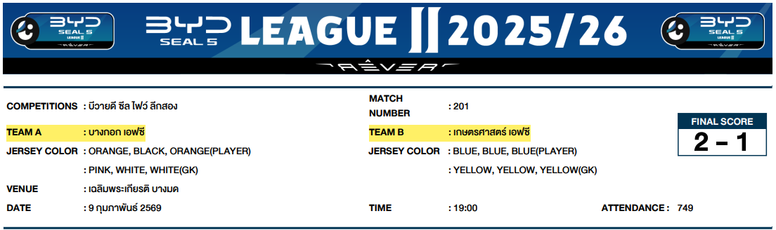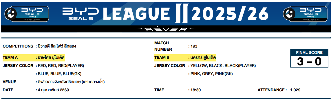 2. การแข่งขันกีฬาฟุตบอลลีกอาชีพรายการบีวายดี ซีล ไฟว์ ลีกสอง วันที่ 4 กุมภาพันธ์ 2569 คู่ระหว่างสโมสรราษีไศล ยูไนเต็ด พบ สโมสรนครศรี ยูไนเต็ด (สโมสรนครศรี ยูไนเต็ด ร้องเรียนมา 1 เหตุการณ์)