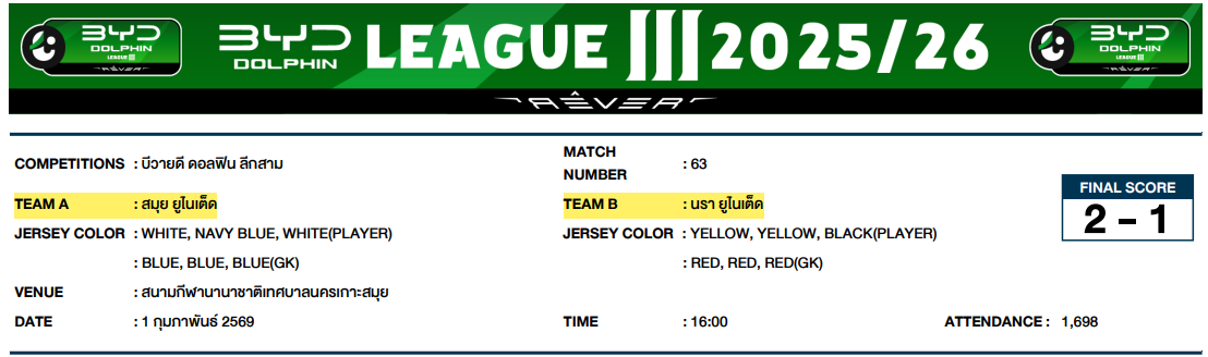 4. การแข่งขันกีฬาฟุตบอลลีกอาชีพรายการบีวายดี ดอลฟิน ลีกสาม วันที่ 1 กุมภาพันธ์ 2569 คู่ระหว่างสโมสรสมุย ยูไนเต็ด พบ สโมสรนรา ยูไนเต็ด (สโมสรนรา ยูไนเต็ด ร้องเรียนมา 1 เหตุการณ์)