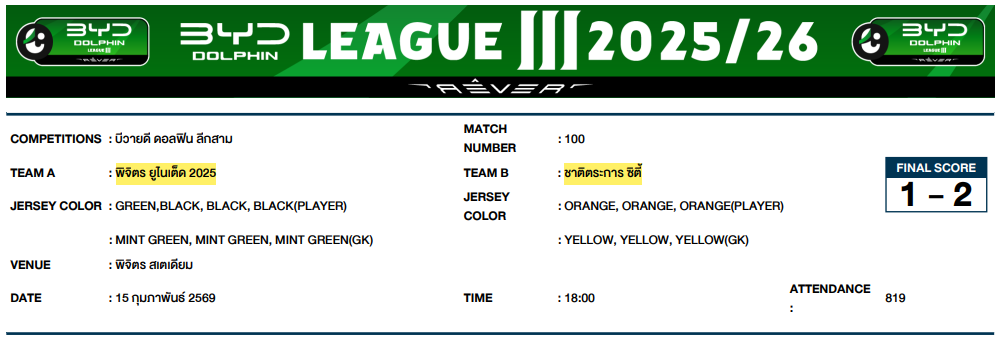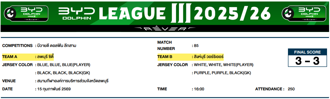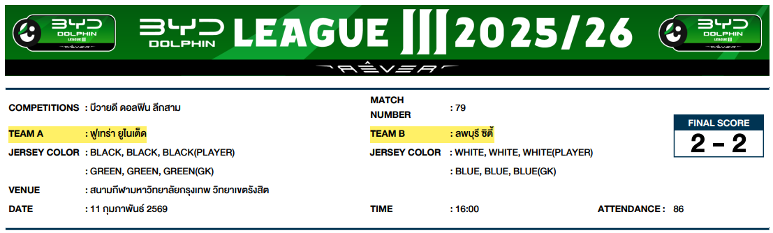 4.การแข่งขันกีฬาฟุตบอลลีกอาชีพรายการบีวายดี ดอลฟิน ลีกสาม วันที่ 11 กุมภาพันธ์ 2569 คู่ระหว่างสโมสรฟูเทร่า ยูไนเต็ด พบ สโมสรลพบุรี ซิตี้ (สโมสรฟูเทร่า ยูไนเต็ด ร้องเรียนมา 3 เหตุการณ์)