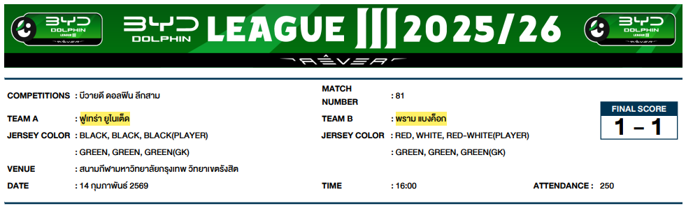7.การแข่งขันกีฬาฟุตบอลลีกอาชีพรายการบีวายดี ดอลฟิน ลีกสาม วันที่ 14 กุมภาพันธ์ 2569 คู่ระหว่างสโมสรฟูเทร่า ยูไนเต็ด พบ สโมสรพราม แบงค็อก (สโมสรพราม แบงค็อก ร้องเรียนมา 1 หตุการณ์)
