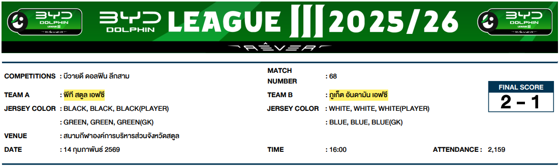 6.การแข่งขันกีฬาฟุตบอลลีกอาชีพรายการบีวายดี ดอลฟิน ลีกสาม วันที่ 14 กุมภาพันธ์ 2569 คู่ระหว่างสโมสรพีที สตูล เอฟซี พบ สโมสรภูเก็ต อันดามัน เอฟซี (สโมสรพีที สตูล เอฟซี ร้องเรียนมา 1 เหตุการณ์)