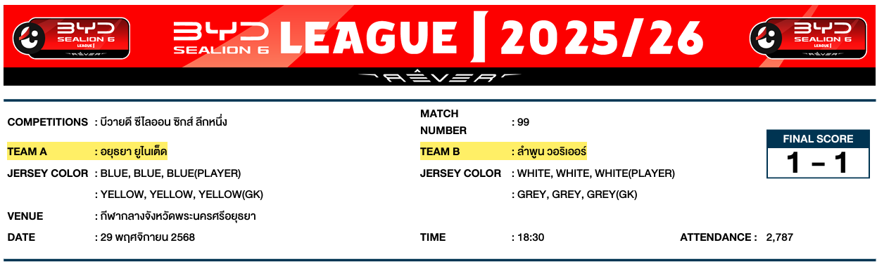 การแข่งขันกีฬาฟุตบอลลีกอาชีพรายการบีวายดี ซีไลออน ซิกส์ ลีกหนึ่ง วันที่ 29 พฤศจิกายน 2568 คู่ระหว่างสโมสรอยุธยา ยูไนเต็ด พบ สโมสรลำพูน วอริเออร์ (สโมสรอยุธยา ยูไนเต็ด ร้องเรียนมา 1 เหตุการณ์)