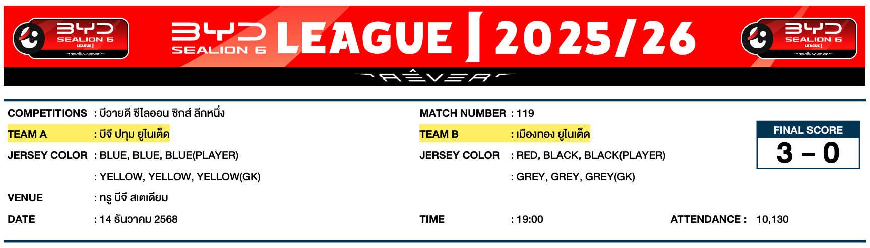 3. การแข่งขันกีฬาฟุตบอลรายการบีวายดี ซีไลออน ซิกส์ ลีกหนึ่ง วันที่ 14 ธันวาคม 2568 คู่ระหว่างสโมสรบีจี ปทุม ยูไนเต็ด พบ สโมสรเมืองทอง ยูไนเต็ด