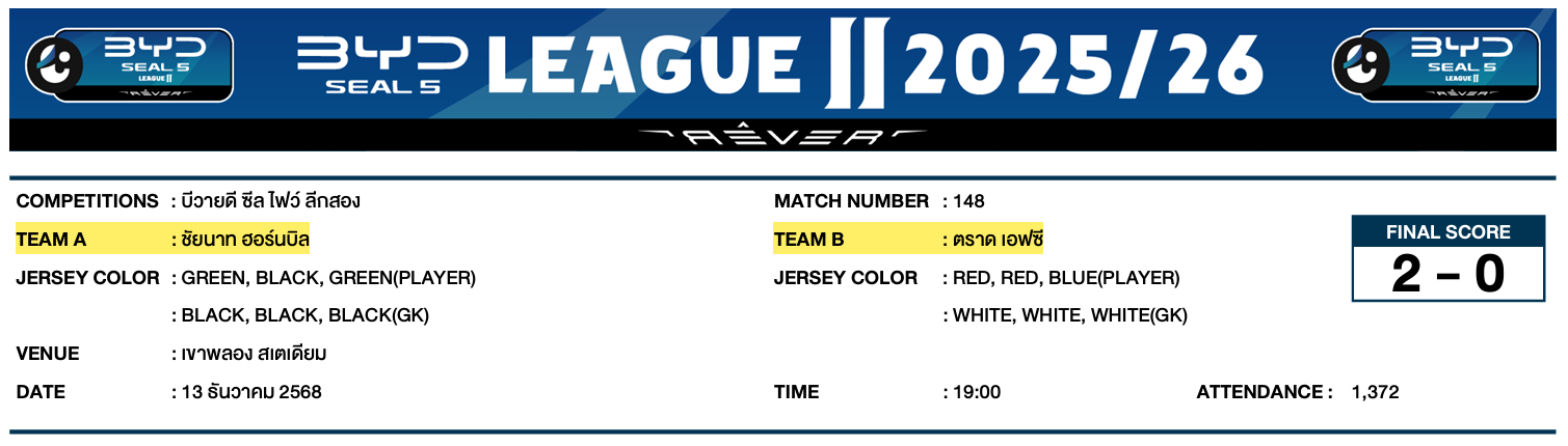 4. การแข่งขันกีฬาฟุตบอลรายการบีวายดี ซีล ไฟว์ ลีกสอง วันที่ 13 ธันวาคม 2568 คู่ระหว่างสโมสรชัยนาท ฮอร์นบิล พบ สโมสรตราด เอฟซี
