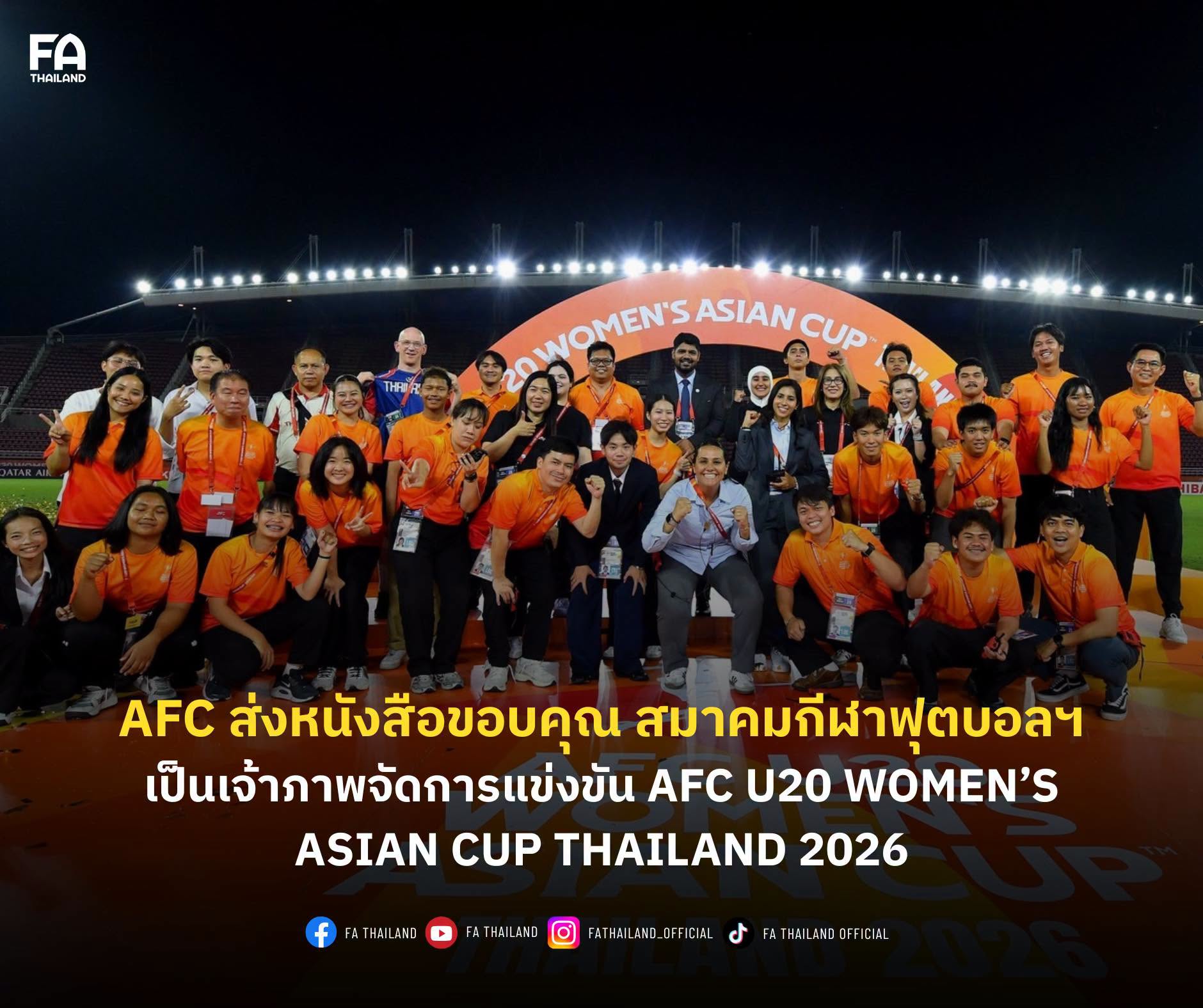 สมาพันธ์ฟุตบอลแห่งเอเชีย หรือ เอเอฟซี ส่งหนังสือ แสดงความยินดีกับ สมาคมกีฬาฟุตบอลแห่งประเทศไทยฯ และคณะกรรมการจัดการแข่งขัน (LOC) สำหรับความสำเร็จในการจัดการแข่งขันฟุตบอลหญิงชิงแชมป์เอเชีย รุ่นอายุไม่เกิน 20 ปี รายการ AFC U20 Women’s Asian Cup Thailand 2026 ณ กรุงเทพมหานคร ประเทศไทย ในช่วงระหว่างวันที่ 1-18 เมษายน 2569