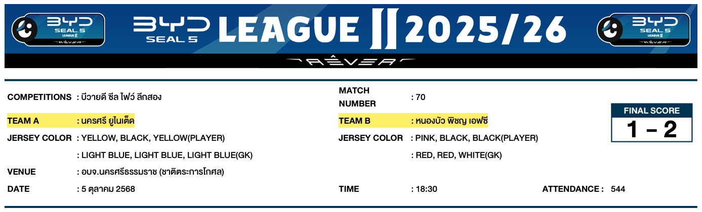 4. การแข่งขันกีฬาฟุตบอลรายการ บีวายดี ซีล ไฟว์ ลีกสอง วันที่ 5 ตุลาคม 2568 คู่ระหว่างสโมสรนครศรี ยูไนเต็ด พบ สโมสรหนองบัว พิชญ เอฟซี