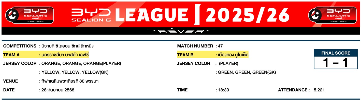 2. การแข่งขันกีฬาฟุตบอลลีกอาชีพรายการบีวายดี ซีไลออน ซิกส์ ลีกหนึ่ง วันที่ 28 กันยายน 2568 คู่ระหว่างสโมสรนครราชสีมา มาสด้า เอฟซี พบ สโมสรเมืองทอง ยูไนเต็ด (สโมสรเมืองทอง ยูไนเต็ด ร้องเรียนมา 1 เหตุการณ์)