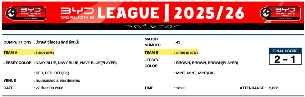 1. การแข่งขันกีฬาฟุตบอลลีกอาชีพรายการบีวายดี ซีไลออน ซิกส์ ลีกหนึ่ง วันที่ 27 กันยายน 2568 คู่ระหว่างสโมสรระยอง เอฟซี พบ สโมสรอุทัยธานี เอฟซี (สโมสรอุทัยธานี เอฟซี ร้องเรียนมา 1 เหตุการณ์)