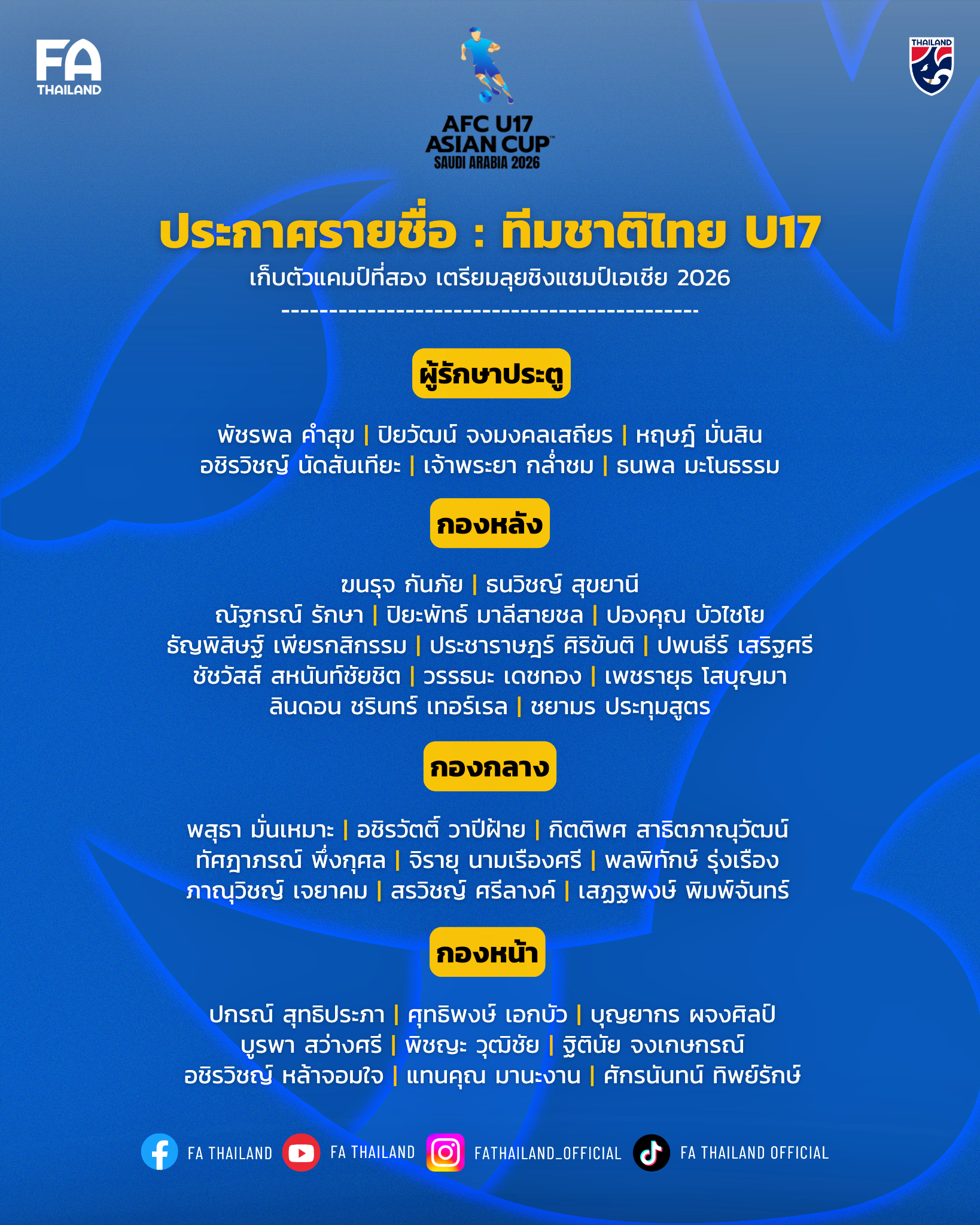 สมาคมกีฬาฟุตบอลแห่งประเทศไทย ในพระบรมราชูปถัมภ์ ประกาศรายชื่อ 37 นักฟุตบอลชายทีมชาติไทย รุ่นอายุไม่เกิน 17 ปี เก็บตัวฝึกซ้อมแคมป์ที่สอง เพื่อเตรียมความพร้อมสำหรับทำการแข่งขันฟุตบอลชิงแชมป์เอเชีย รุ่นอายุไม่เกิน 17 ปี 2026 รอบสุดท้าย (AFC U17 Asian Cup Saudi Arabia 2026) ระหว่างวันที่ 5 – 22 พฤษภาคม 2569 ณ ประเทศซาอุดีอาระเบีย ภายใต้การคุมทัพของ “มาร์โค ก็อคเคิ่ล” หัวหน้าผู้ฝึกสอน