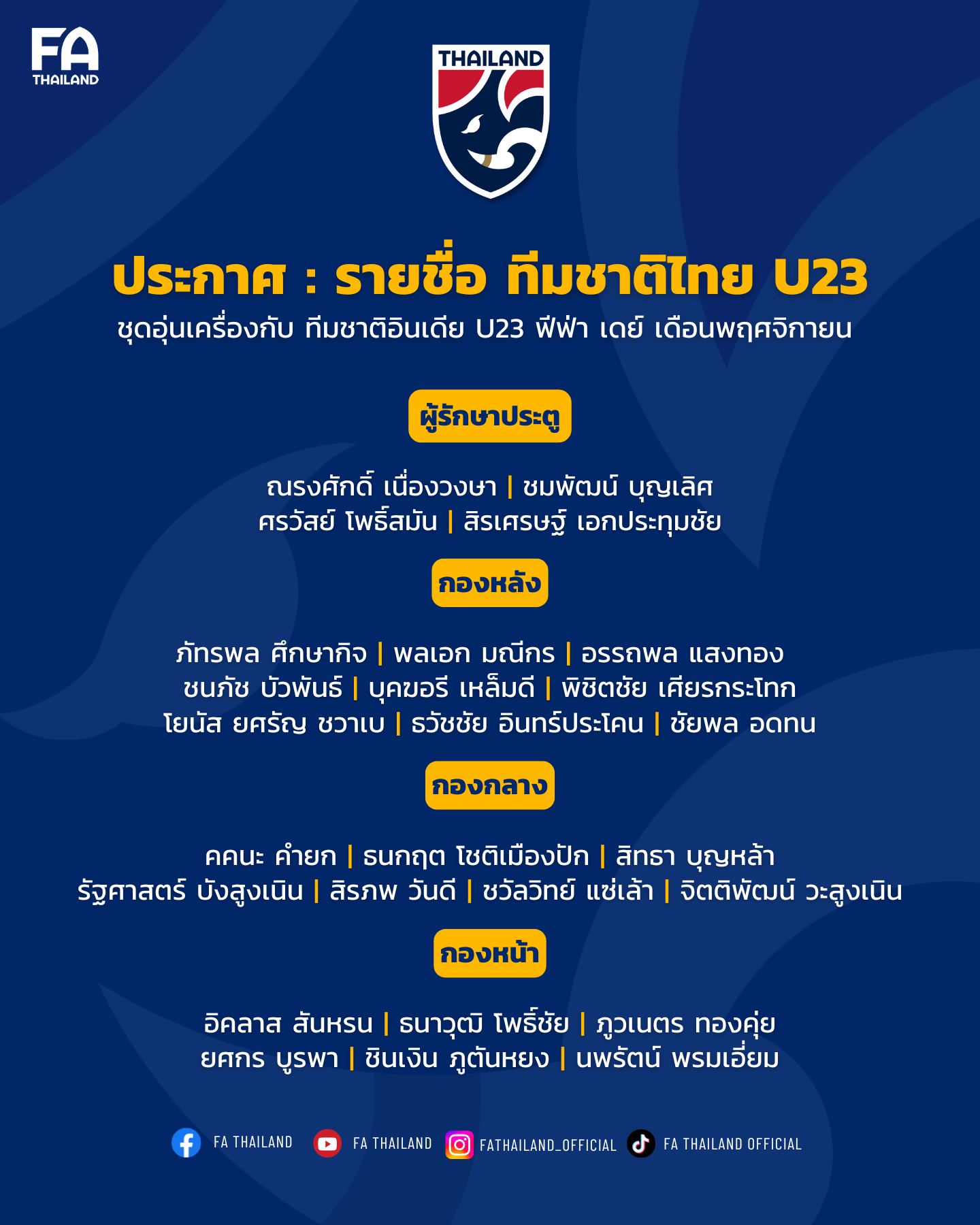 สมาคมกีฬาฟุตบอลแห่งประเทศไทย ในพระบรมราชูปถัมภ์ ประกาศรายชื่อ 23 นักฟุตบอลชายทีมชาติไทย รุ่นอายุไม่เกิน 23 ปี เตรียมความพร้อมสำหรับการแข่งขันฟุตบอลอุ่นเครื่องนัดพิเศษ ที่จะพบกับ ทีมชาติอินเดีย U23 ในช่วงฟีฟ่า เดย์ ระหว่างวันที่ 10-18 พฤศจิกายน 2568 ภายใต้การคุมทัพของ "โค้ชวัง" ธวัชชัย ดำรงอ่องตระกูล หัวหน้าผู้ฝึกสอน