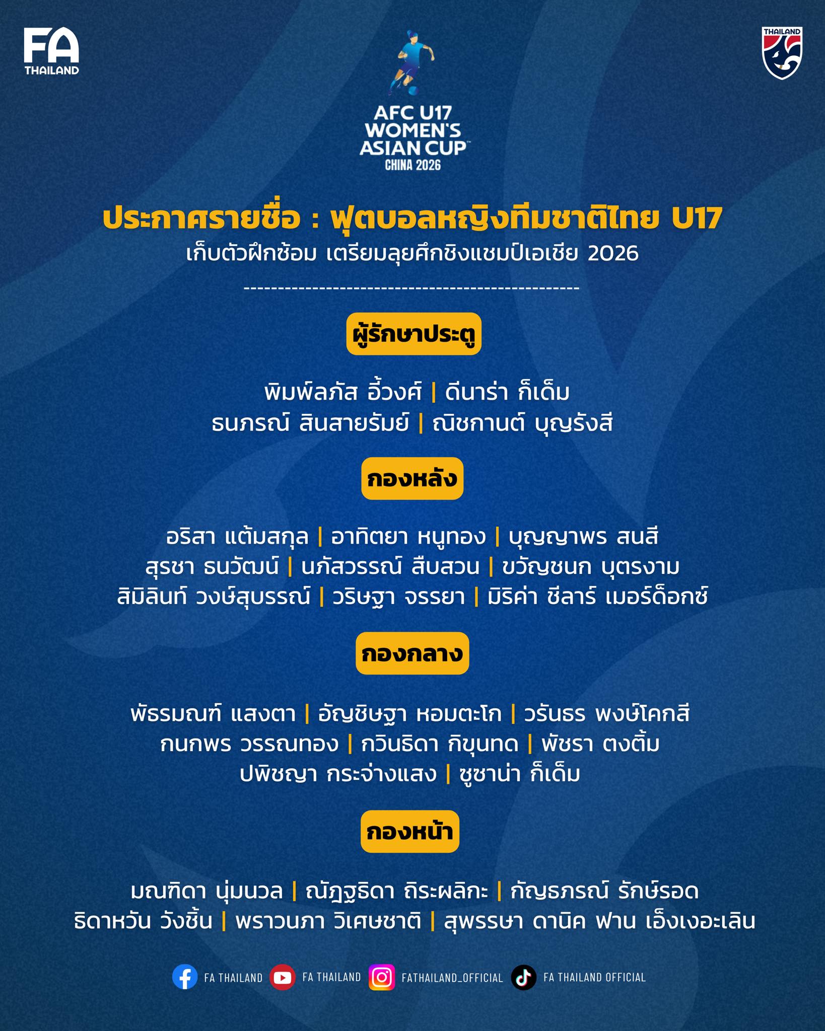 สมาคมกีฬาฟุตบอลแห่งประเทศไทย ในพระบรมราชูปถัมภ์ ประกาศรายชื่อ 27 นักฟุตบอลหญิงทีมชาติไทย รุ่นอายุไม่เกิน 17 ปี เพื่อเก็บตัวฝึกซ้อม เตรียมความพร้อมก่อนทำการแข่งขันฟุตบอลหญิงชิงแชมป์เอเชีย รุ่นอายุไม่เกิน 17 ปี 2026 (AFC U17 Women's Asian Cup China 2026) ระหว่างวันที่ 1-17 พฤษภาคม 2569 ณ เมืองซูโจว สาธารณรัฐประชาชนจีน ภายใต้การคุมทัพของ "โค้ชมิ่ม" ธิดารัตน์ วิวาสุขุ หัวหน้าผู้ฝึกสอน