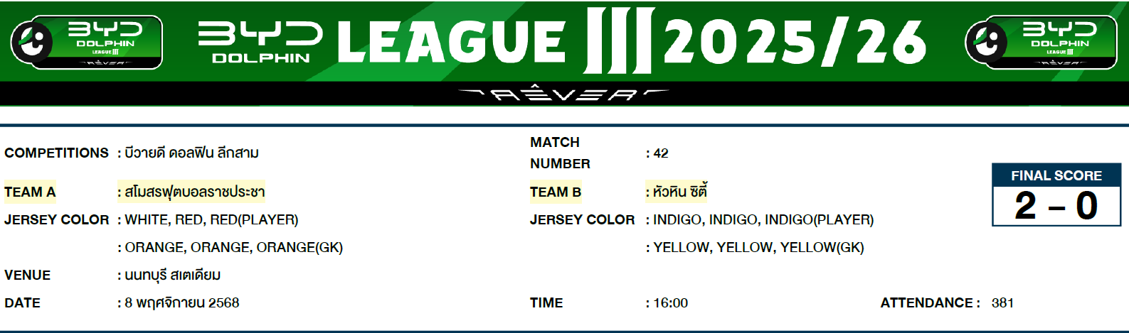 3. การแข่งขันกีฬาฟุตบอลรายการบีวายดี ดอลฟิน ลีกสาม วันที่ 8 พฤศจิกายน 2568 คู่ระหว่างสโมสรฟุตบอลราชประชา พบ สโมสรหัวหิน ซิตี้