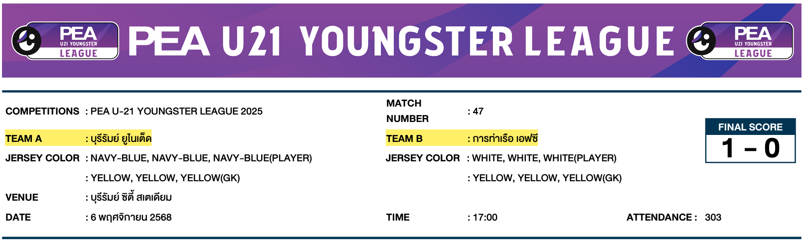 4. การแข่งขันกีฬาฟุตบอลรายการ “PEA U-21 YOUNGSTER LEAGUE 2025” วันที่ 6 พฤศจิกายน 2568 คู่ระหว่างสโมสรบุรีรัมย์ ยูไนเต็ด พบ สโมสรการท่าเรือ เอฟซี