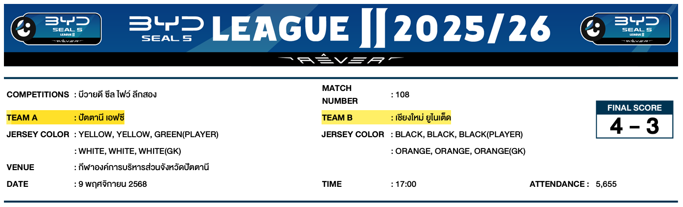 1. การแข่งขันกีฬาฟุตบอลรายการบีวายดี ซีล ไฟว์ ลีกสอง วันที่ 9 พฤศจิกายน 2568 คู่ระหว่างสโมสรปัตตานี เอฟซี พบ สโมสรเชียงใหม่ ยูไนเต็ด