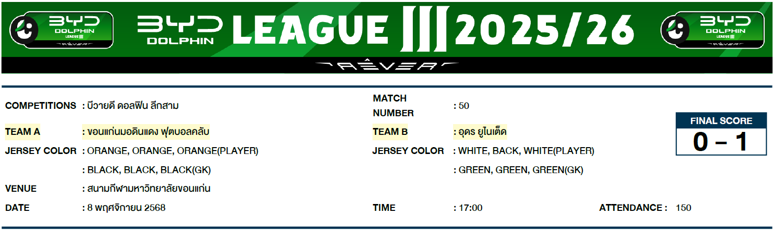 2. การแข่งขันกีฬาฟุตบอลรายการบีวายดี ดอลฟิน ลีกสาม วันที่ 8 พฤศจิกายน 2568 คู่ระหว่างสโมสรขอนแก่นมอดินแดง ฟุตบอลคลับ พบ สโมสรอุดร ยูไนเต็ด