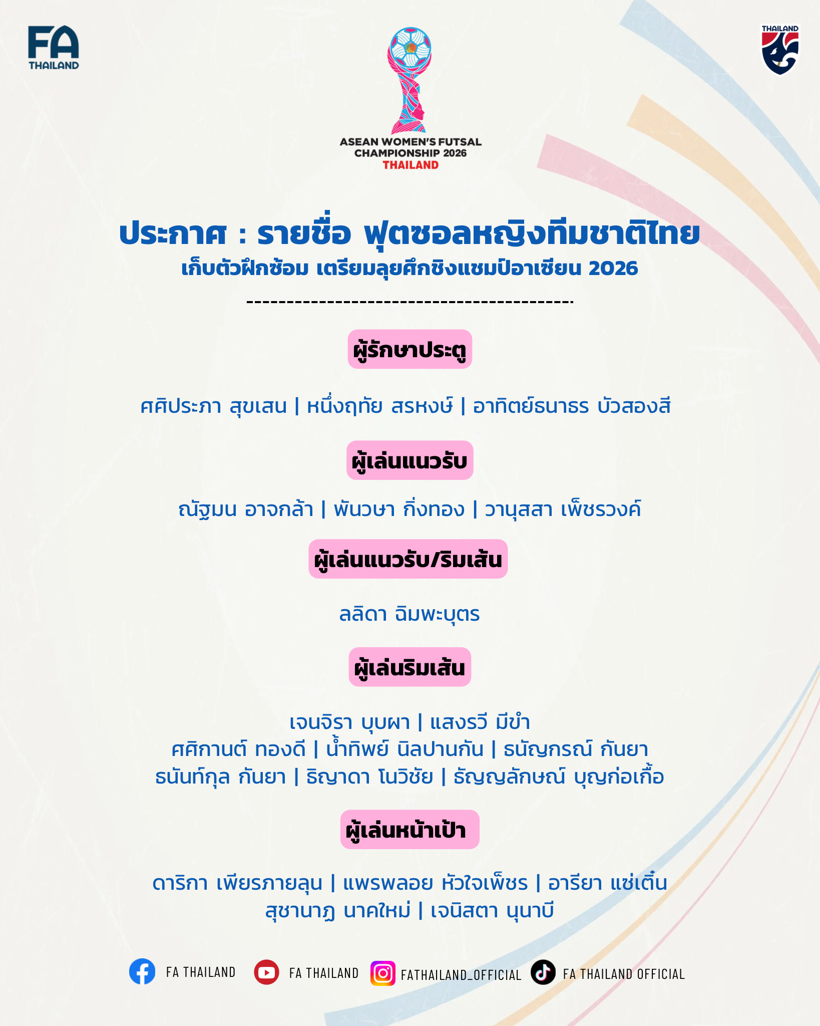 สมาคมกีฬาฟุตบอลที่สามารถแข่งขันในพระบรมราชูปถัมภ์ ประกาศรายชื่อ 20 รายชื่อนักกีฬาหญิงทีมชาติไทยเพื่อเก็บตัวฝึกซ้อมก่อนทำการแข่งออฟฟิตหญิงชิงเอเชีย 2026 (Asean Women's Futsal Championship 2026) ซึ่งจะดำเนินการทัวร์ในวันที่ 23–28 กุมภาพันธ์ 2569 ณ นำเสนอรินมินอล 21 โคราชจังหวัดนครราชสีมาภายใต้การควบคุมดูแลของ “โค้ชโอ” ธนาธร สันทนาประสิทธิ์ หัวหน้าผู้ฝึกสอน