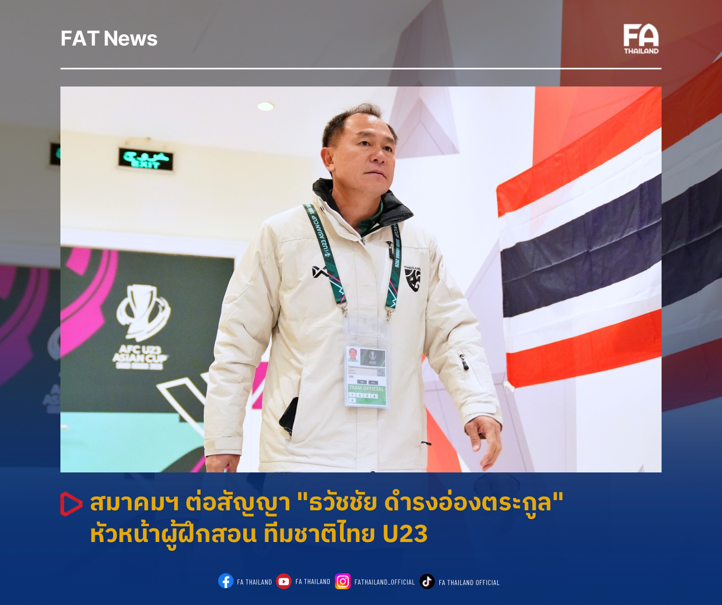 สมาคมกีฬาฟุตบอลแห่งประเทศไทยฯ บรรลุข้อตกลงขยายสัญญาฉบับใหม่กับ "ธวัชชัย ดำรงอ่องตระกูล" หัวหน้าผู้ฝึกสอนฟุตบอลชายทีมชาติไทย รุ่นอายุไม่เกิน 23 ปี ออกไปเป็นที่เรียบร้อย ด้วยสัญญาจนถึงสิ้นสุดการแข่งขันฟุตบอลชายในมหกรรมเอเชียน เกมส์ ครั้งที่ 20 ที่ ประเทศญี่ปุ่น