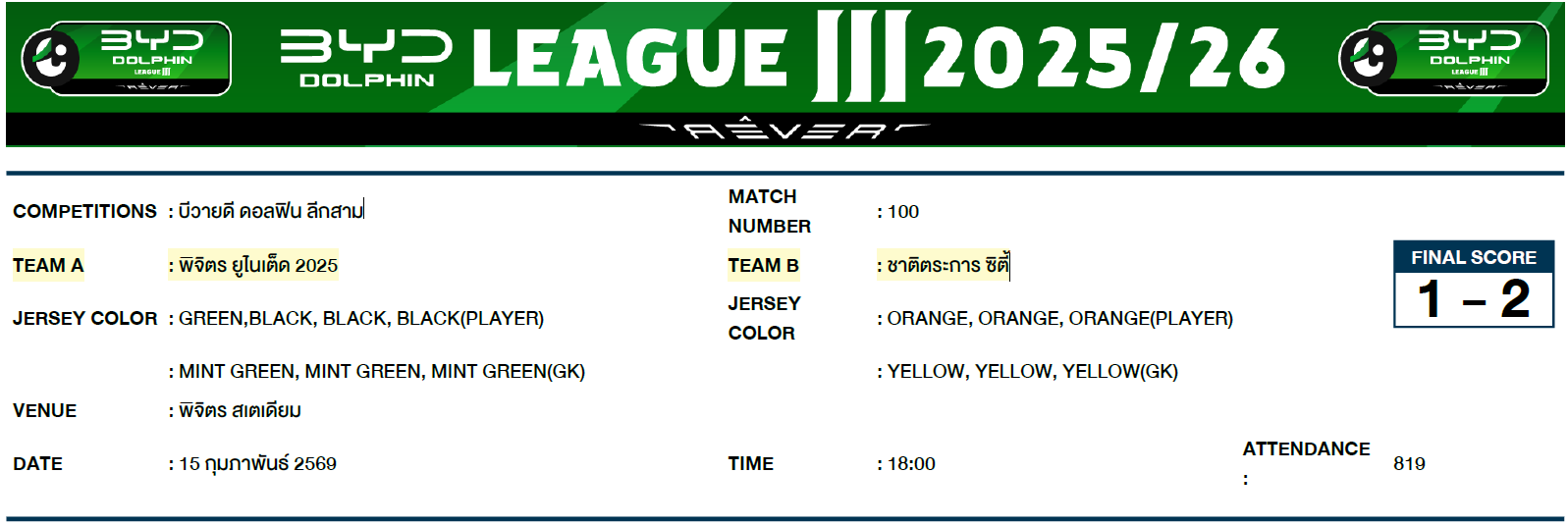 4. การแข่งขันกีฬาฟุตบอลรายการบีวายดี ดอลฟิน ลีกสาม วันที่ 15 กุมภาพันธ์ 2569 คู่ระหว่างสโมสรพิจิตร ยูไนเต็ด 2025 พบ สโมสรชาติตระการ ซิตี้