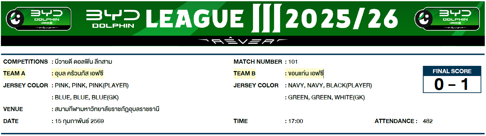 6. การแข่งขันกีฬาฟุตบอลรายการบีวายดี ดอลฟิน ลีกสาม วันที่ 15 กุมภาพันธ์ 2569 คู่ระหว่างสโมสรอุบล ครัวนภัส เอฟซี พบ สโมสรขอนแก่น เอฟซี