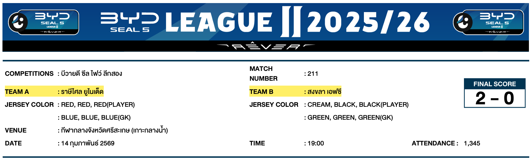 3. การแข่งขันกีฬาฟุตบอลรายการบีวายดี ซีล ไฟว์ ลีกสอง วันที่ 14 กุมภาพันธ์ 2569 คู่ระหว่างสโมสรราษีไศล ยูไนเต็ด พบ สโมสรสงขลา เอฟซี