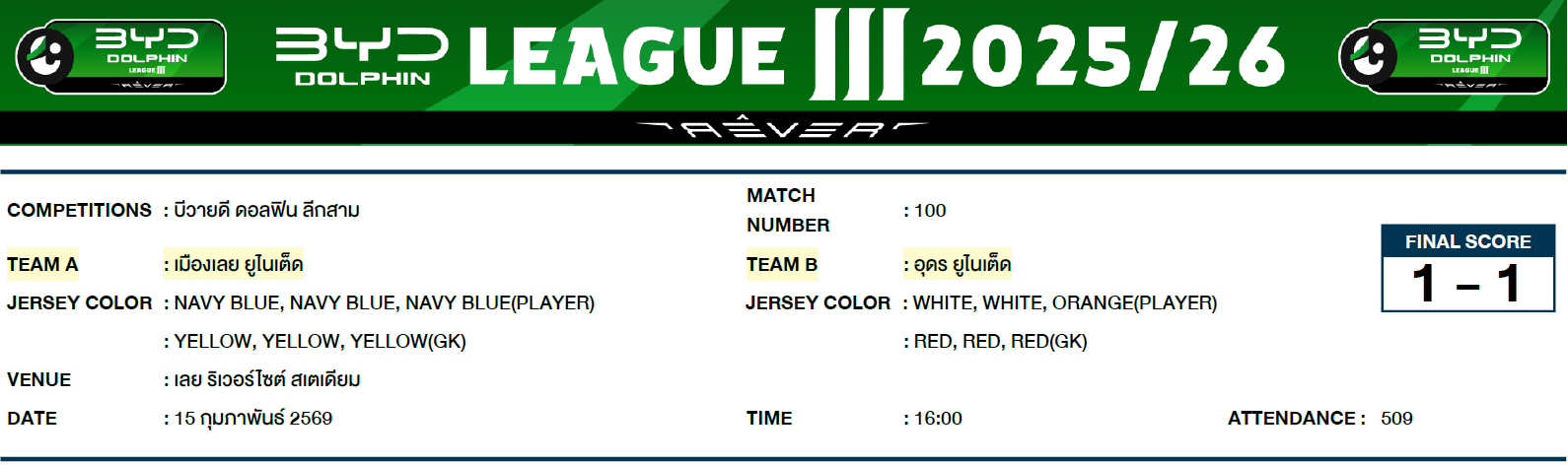 5. การแข่งขันกีฬาฟุตบอลรายการบีวายดี ดอลฟิน ลีกสาม วันที่ 15 กุมภาพันธ์ 2569 คู่ระหว่างสโมสรเมืองเลย ยูไนเต็ด พบ สโมสรอุดร ยูไนเต็ด
