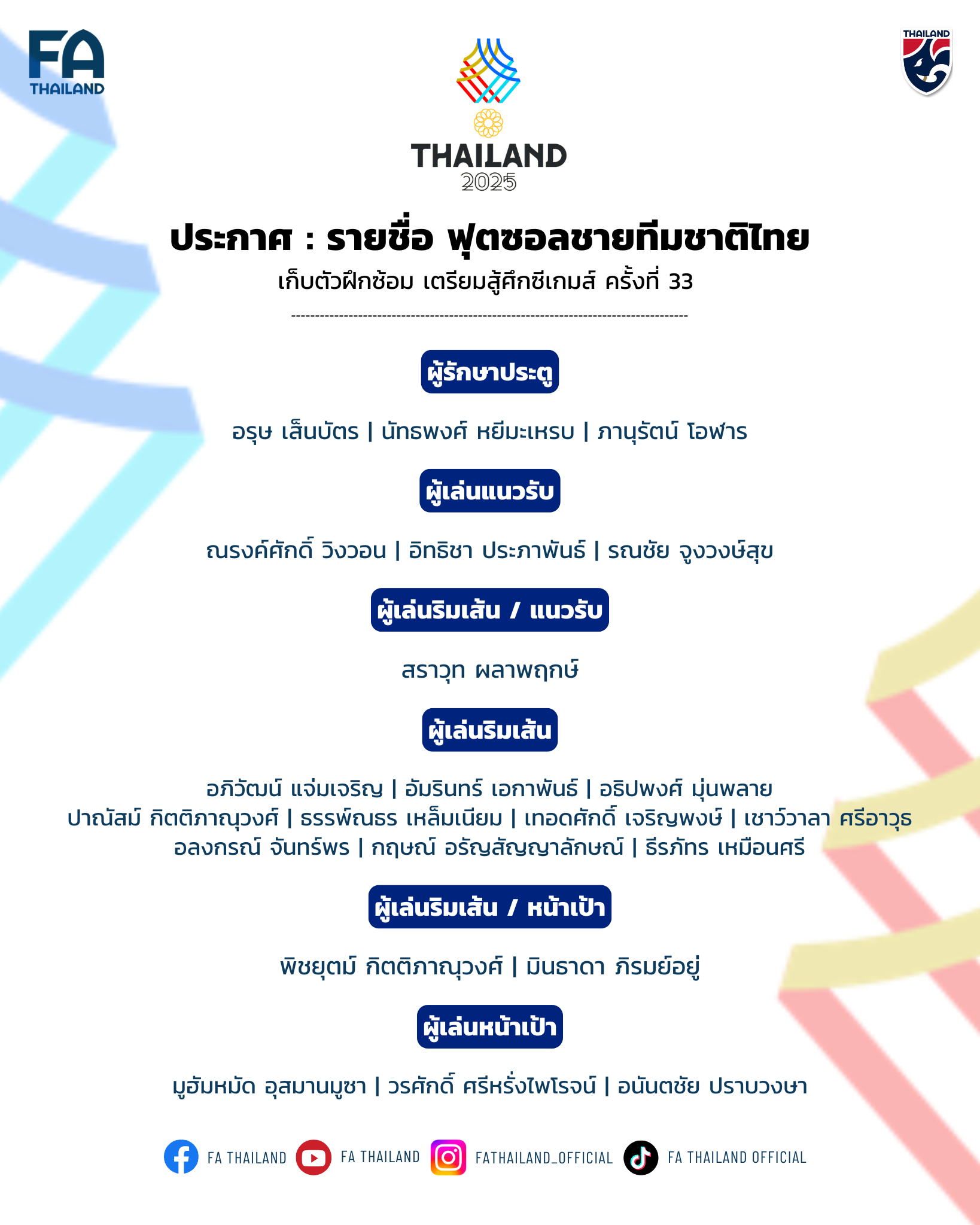 สมาคมกีฬาฟุตบอลแห่งประเทศไทย ในพระบรมราชูปถัมภ์ ประกาศรายชื่อ 22 นักฟุตซอลชายทีมชาติไทย เพื่อเก็บตัวฝึกซ้อม เตรียมความพร้อมก่อนทำการแข่งขันมหกรรมกีฬาซีเกมส์ ครั้งที่ 33 ที่ประเทศไทยเป็นเจ้าภาพ ระหว่างวันที่ 9-20 ธันวาคม 2568 ณ ยิมเนเซี่ยม สนามกีฬากลางจังหวัดนนทบุรี ภายใต้การคุมทัพของ “มิเกล โรดริโก้” หัวหน้าผู้ฝึกสอนชาวสเปน