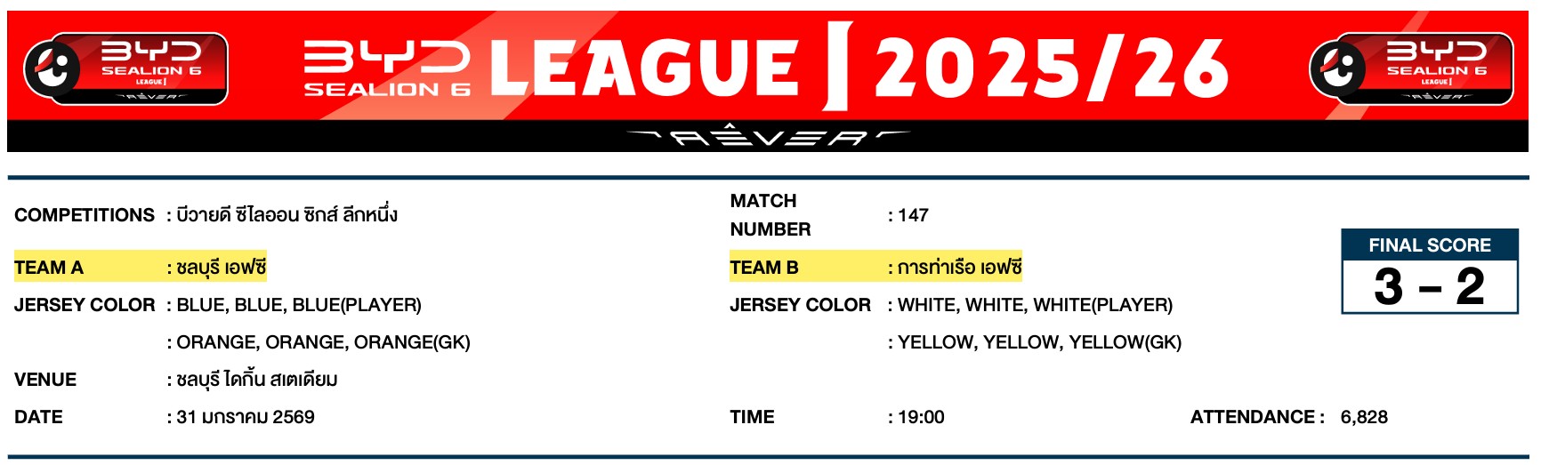 1. การแข่งขันกีฬาฟุตบอลรายการบีวายดี ซีไลออน ซิกส์ ลีกหนึ่ง วันที่ 31 มกราคม 2569 คู่ระหว่างสโมสรชลบุรี เอฟซี พบ สโมสรการท่าเรือ เอฟซี