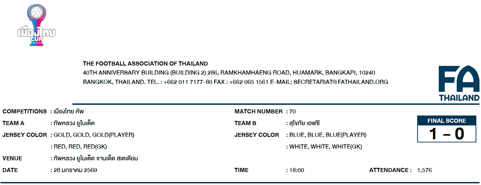 2. การแข่งขันกีฬาฟุตบอลรายการเมืองไทย คัพ วันที่ 28 มกราคม 2569 คู่ระหว่างสโมสรทัพหลวง ยูไนเต็ด พบ สโมสรสุโขทัย เอฟซี