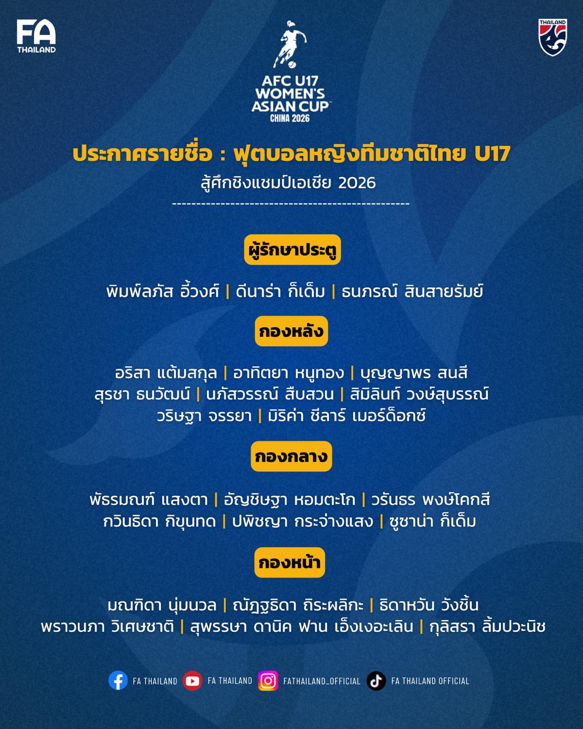 สมาคมกีฬาฟุตบอลแห่งประเทศไทย ในพระบรมราชูปถัมภ์ ประกาศรายชื่อ 23 นักฟุตบอลหญิงทีมชาติไทย รุ่นอายุไม่เกิน 17 ปี ชุดทำการแข่งขันฟุตบอลหญิงชิงแชมป์เอเชีย รุ่นอายุไม่เกิน 17 ปี 2026 (AFC U17 Women's Asian Cup China 2026) ระหว่างวันที่ 1-17 พฤษภาคม 2569 ณ เมืองซูโจว สาธารณรัฐประชาชนจีน ภายใต้การคุมทัพของ "โค้ชมิ่ม" ธิดารัตน์ วิวาสุขุ หัวหน้าผู้ฝึกสอน
