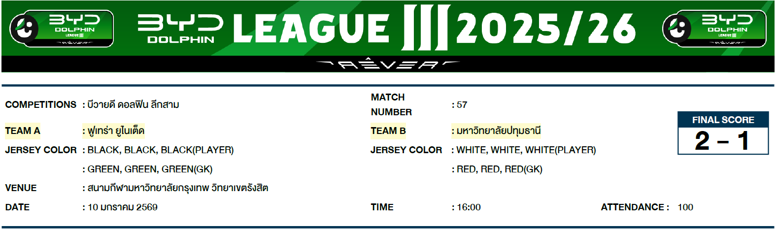 2. การแข่งขันกีฬาฟุตบอลรายการบีวายดี ดอลฟิน ลีกสาม วันที่ 10 มกราคม 2569 คู่ระหว่างสโมสรฟูเทร่า ยูไนเต็ด พบ สโมสรมหาวิทยาลัยปทุมธานี
