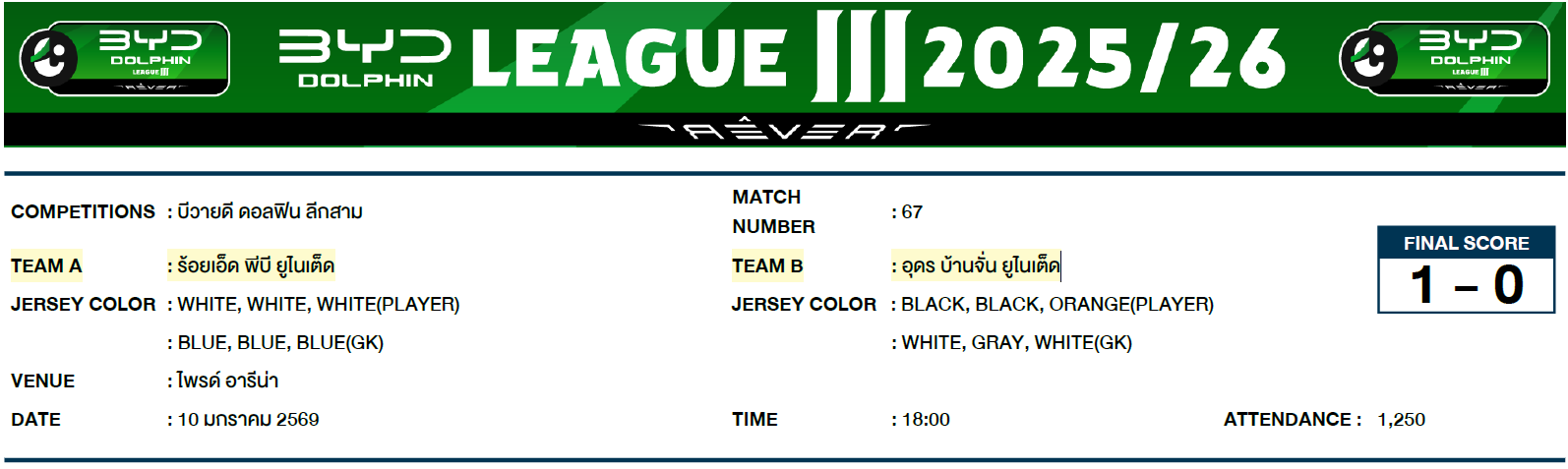 4. การแข่งขันกีฬาฟุตบอลรายการบีวายดี ดอลฟิน ลีกสาม วันที่ 10 มกราคม 2569 คู่ระหว่างสโมสรร้อยเอ็ด พีบี ยูไนเต็ด พบ สโมสรอุดร บ้านจั่น ยูไนเต็ด