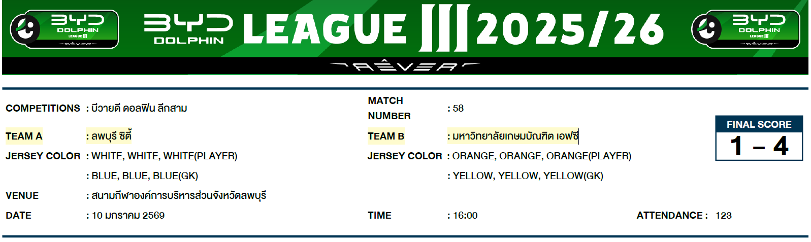 3. การแข่งขันกีฬาฟุตบอลรายการบีวายดี ดอลฟิน ลีกสาม วันที่ 10 มกราคม 2569 คู่ระหว่างสโมสรลพบุรี ซิตี้ พบ สโมสรมหาวิทยาลัยเกษมบัณฑิต เอฟซี