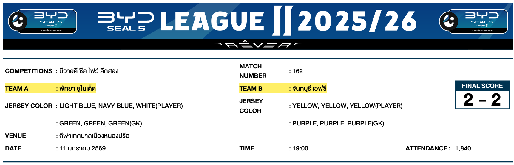 1. การแข่งขันกีฬาฟุตบอลรายการบีวายดี ซีล ไฟว์ ลีกสอง วันที่ 11 มกราคม 2569 คู่ระหว่างสโมสรพัทยา ยูไนเต็ด พบ สโมสรจันทบุรี เอฟซี