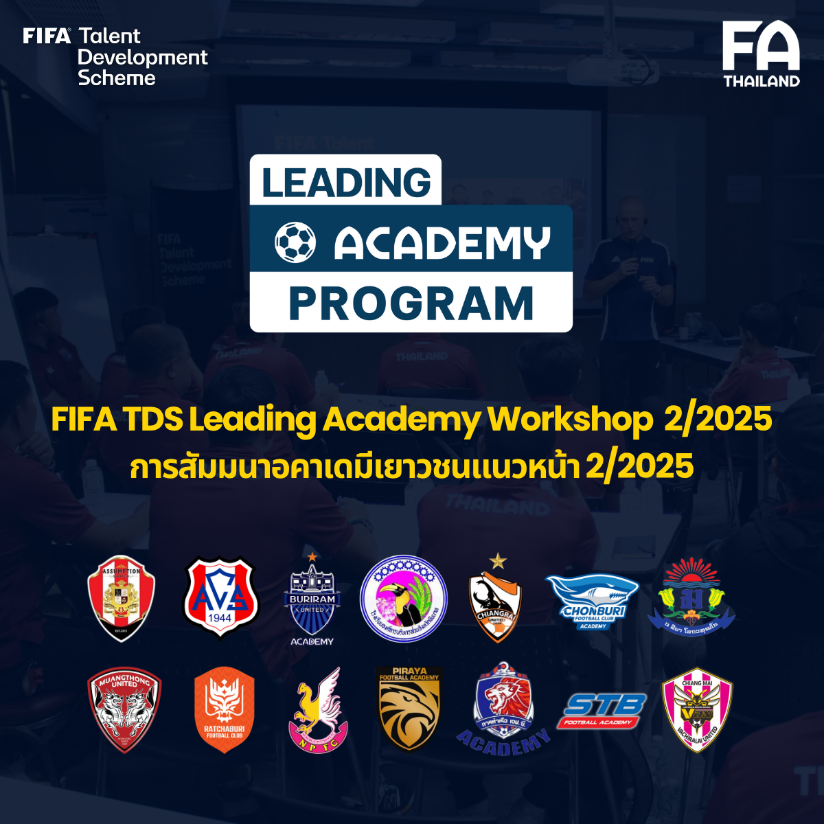 สำหรับกิจกรรมเวิร์คชอป Leading Academy Workshop 2/2025 จัดขึ้นเพื่อเป็นส่วนหนึ่งในกระบวนการสำหรับการยกระดับอคาเดมีในประเทศ เพื่อพัฒนาคุณภาพ ความเป็นมืออาชีพของอคาเดมีให้สูงขึ้น ภายใต้โครงการ FIFA TDS Leading Academy Program และสร้างเครือข่ายอคาเดมีเยาวชนแนวหน้า ตามโครงการของ FIFA Talent Development Scheme ที่จะสร้างแนวทางและความสอดคล้องกับแหล่งผลิตผู้เล่นเยาวชนอย่างมีคุณภาพ ซึ่งโครงการนี้เป็นโครงการนำร่อง เพื่อให้ได้โครงการที่มีเสถียรภาพในการนำมาปรับใช้กับทุกอคาเดมีทั่วประเทศต่อไป