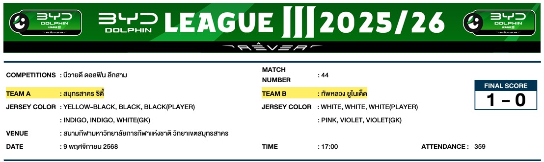 5. การแข่งขันกีฬาฟุตบอลลีกอาชีพรายการบีวายดี ดอลฟิน ลีกสาม วันที่ 9 พฤศจิกายน 2568 คู่ระหว่างสโมสรสมุทรสาคร ซิตี้ พบ สโมสรทัพหลวง ยูไนเต็ด (สโมสรทัพหลวง ยูไนเต็ด ร้องเรียนมา 2 เหตุการณ์)