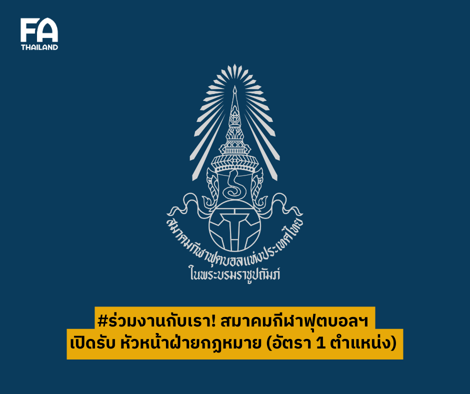 ด้วย สมาคมกีฬาฟุตบอลแห่งประเทศไทย ในพระบรมราชูปถัมภ์ ให้ความสำคัญกับการยกระดับและพัฒนาฟุตบอลไทยทั้งระบบ จึงขอประกาศรับสมัคร "หัวหน้าฝ่ายกฏหมาย" โดยมีข้อมูลและคุณสมบัติ ดังนี้