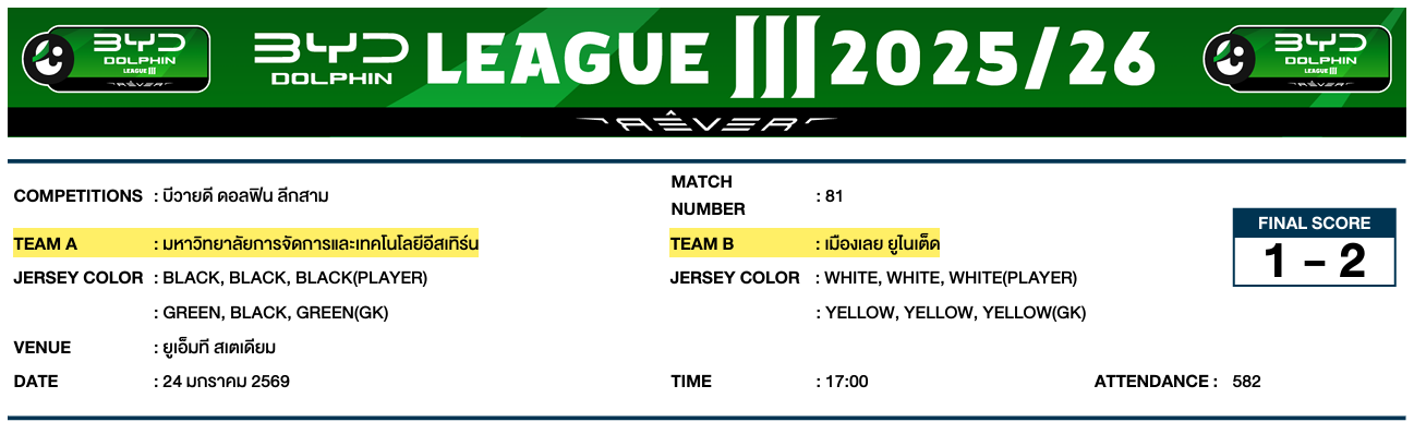 2. การแข่งขันกีฬาฟุตบอลลีกอาชีพรายการบีวายดี ดอลฟิน ลีกสาม วันที่ 24 มกราคม 2569 คู่ระหว่างสโมสรมหาวิทยาลัยการจัดการและเทคโนโลยีอีสเทิร์น พบ สโมสรเมืองเลย ยูไนเต็ด (สโมสรมหาวิทยาลัยการจัดการและเทคโนโลยีอีสเทิร์น ร้องเรียนมา 1 เหตุการณ์)