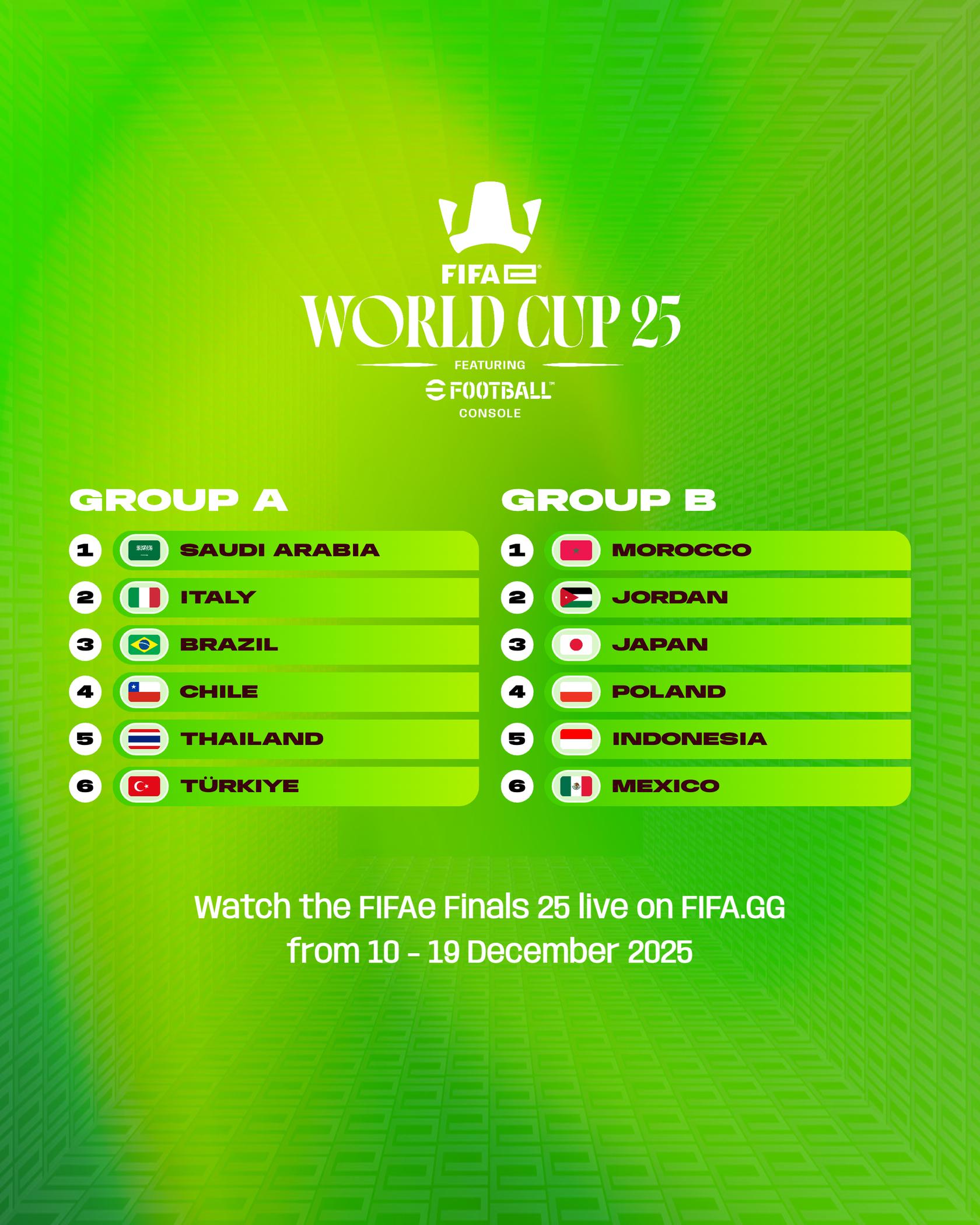 สหพันธ์ฟุตบอลนานาชาติหรือฟีฟ่า จัดพิธีจับสลากแบ่งสายการแข่งขัน FIFAe World Cup 2025 ft. eFootball ประเภท Console ที่จะจัดขึ้นที่ประเทศซาอุดีอาระเบีย ระหว่างวันที่ 10-13 ธันวาคม 2568 นี้