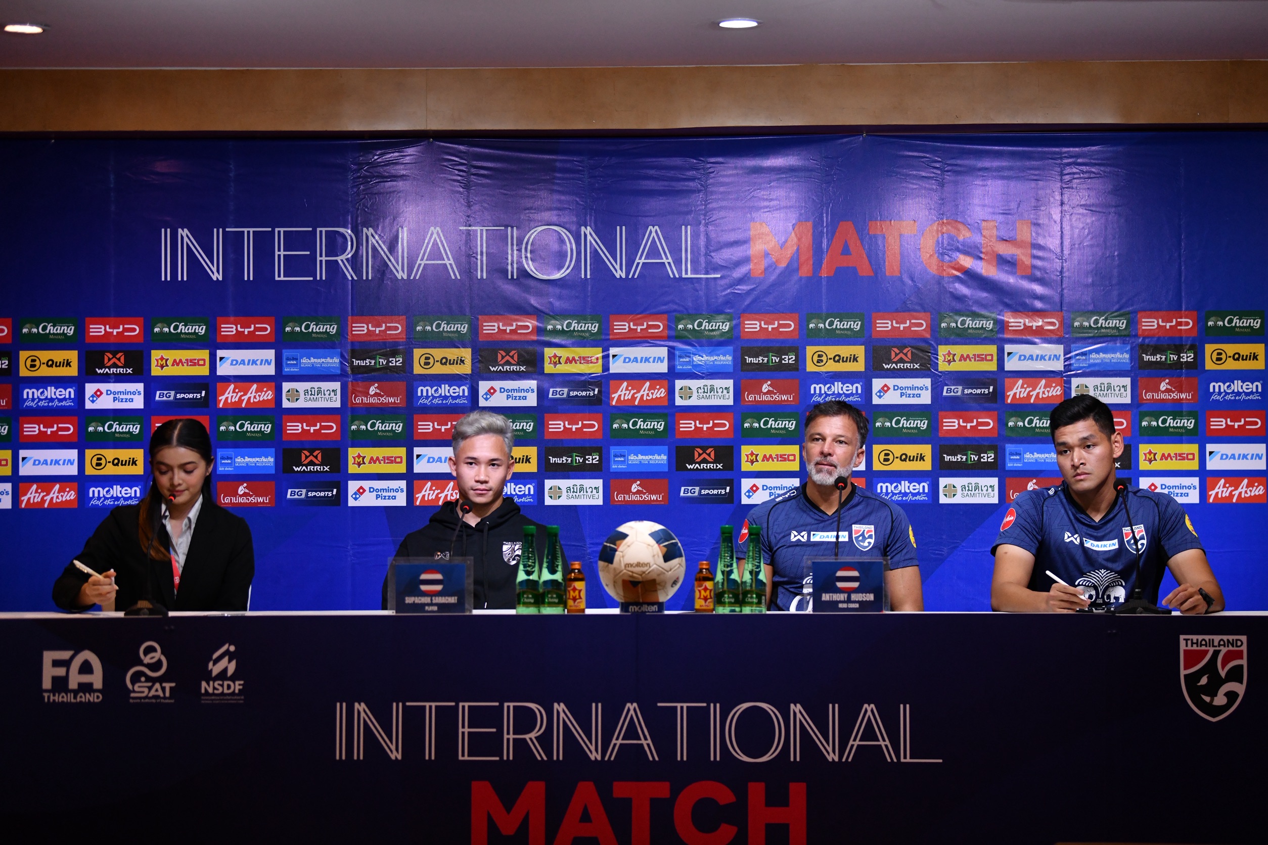 การแถลงข่าวครั้งนี้นำโดย “แอนโธนี ฮัดสัน” หัวหน้าผู้ฝึกสอนฟุตบอลชายทีมชาติไทย พร้อมด้วย “สุภโชค สารชาติ" แนวรุกของทีม