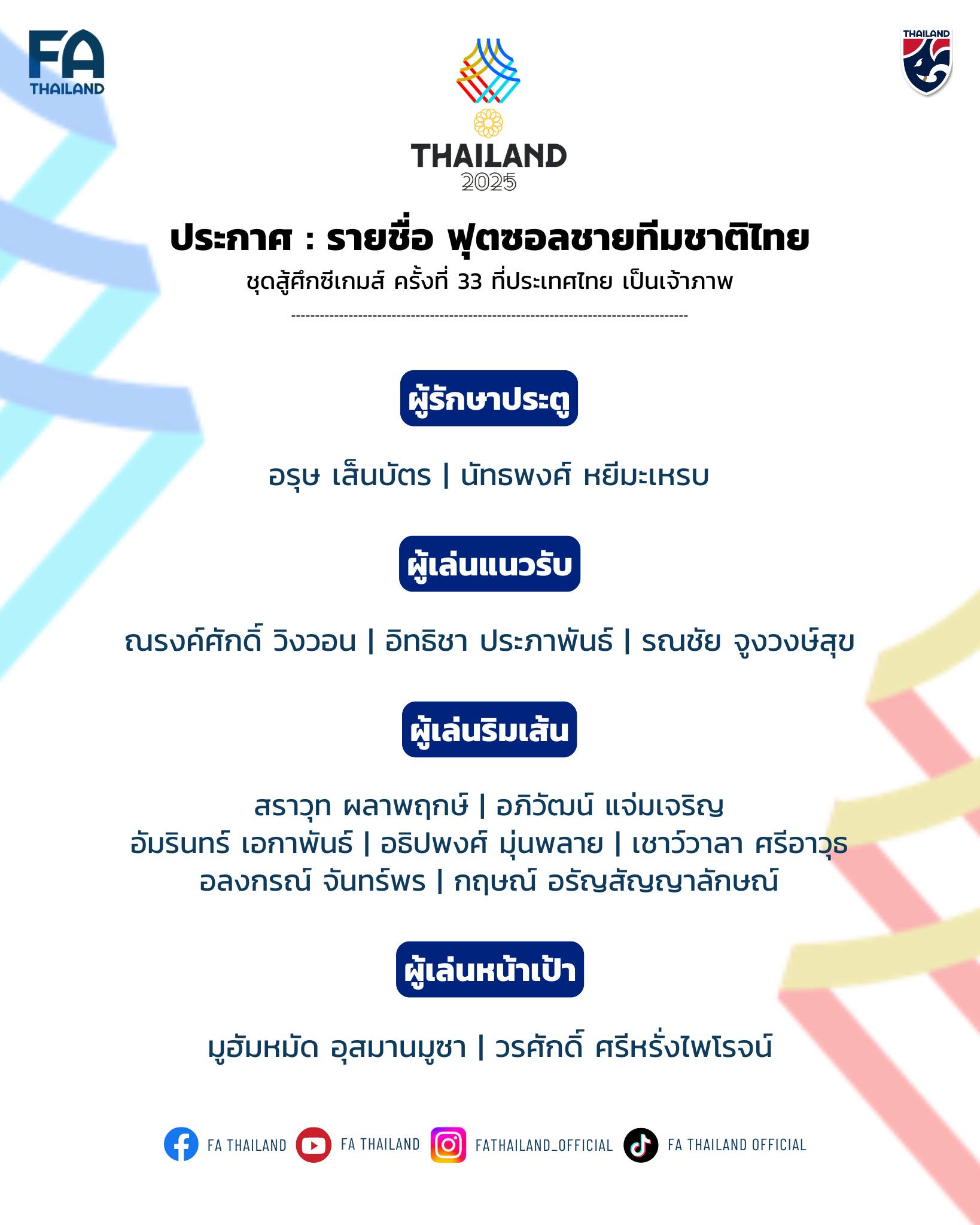 สมาคมกีฬาฟุตบอลแห่งประเทศไทย ในพระบรมราชูปถัมภ์ ประกาศรายชื่อ 14 นักฟุตซอลชายทีมชาติไทย ชุดทำการแข่งขันมหกรรมกีฬาซีเกมส์ ครั้งที่ 33 ที่ประเทศไทยเป็นเจ้าภาพ ระหว่างวันที่ 9-20 ธันวาคม 2568 ณ ยิมเนเซี่ยม สนามกีฬากลางจังหวัดนนทบุรี ภายใต้การคุมทัพของ “มิเกล โรดริโก้” หัวหน้าผู้ฝึกสอนชาวสเปน