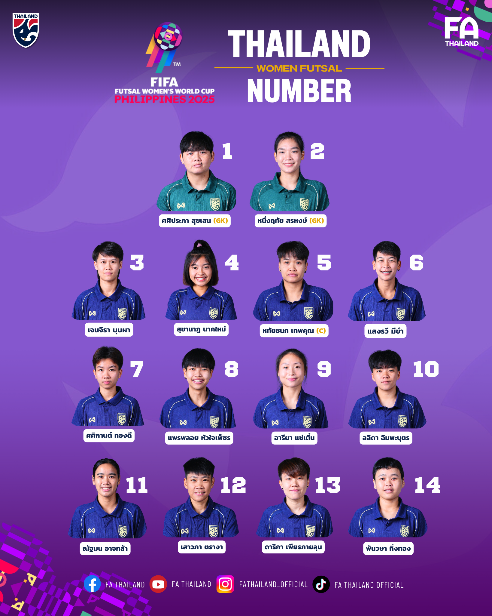 ฟุตซอลหญิงทีมชาติไทย ประกาศหมายเลขเสื้อ นักกีฬาทั้ง 14 คน ที่จะทำการแข่งขันฟุตซอลหญิงชิงแชมป์โลก 2025 (FIFA Futsal Women’s World Cup 2025) ระหว่างวันที่ 21 พฤศจิกายน – 7 ธันวาคม 2568 ณ ประเทศฟิลิปปินส์ ภายใต้การคุมทัพของ “โค้ชโอ” ธนาธร สันทนาประสิทธิ์ หัวหน้าผู้ฝึกสอน