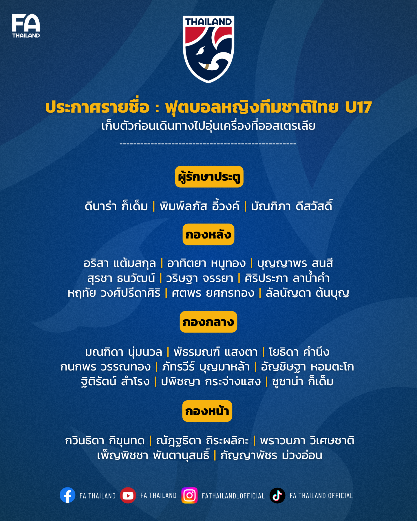 สมาคมกีฬาฟุตบอลแห่งประเทศไทย ในพระบรมราชูปถัมภ์ ประกาศรายชื่อ 26 นักฟุตบอลหญิงทีมชาติไทย รุ่นอายุไม่เกิน 17 ปี ชุดเตรียมทำการแข่งขันฟุตบอลหญิงรายการพิเศษ ASEAN-Australia Football Week ระหว่างวันที่ 22-28 พฤศจิกายน 2568 ณ นครซิดนีย์ ประเทศออสเตรเลีย ภายใต้การคุมทัพของ "โค้ชมิ่ม" ธิดารัตน์ วิวาสุขุ หัวหน้าผู้ฝึกสอน