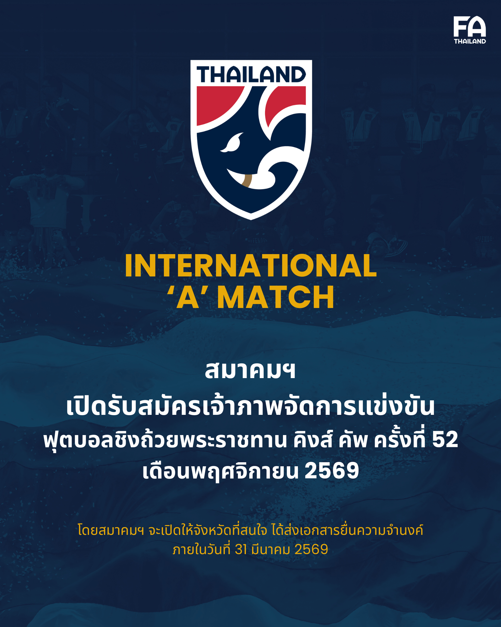 ประกาศ : เปิดรับสมัครเจ้าภาพจัดการแข่งขัน ฟุตบอลชิงถ้วยพระราชทาน คิงส์ คัพ ครั้งที่ 52