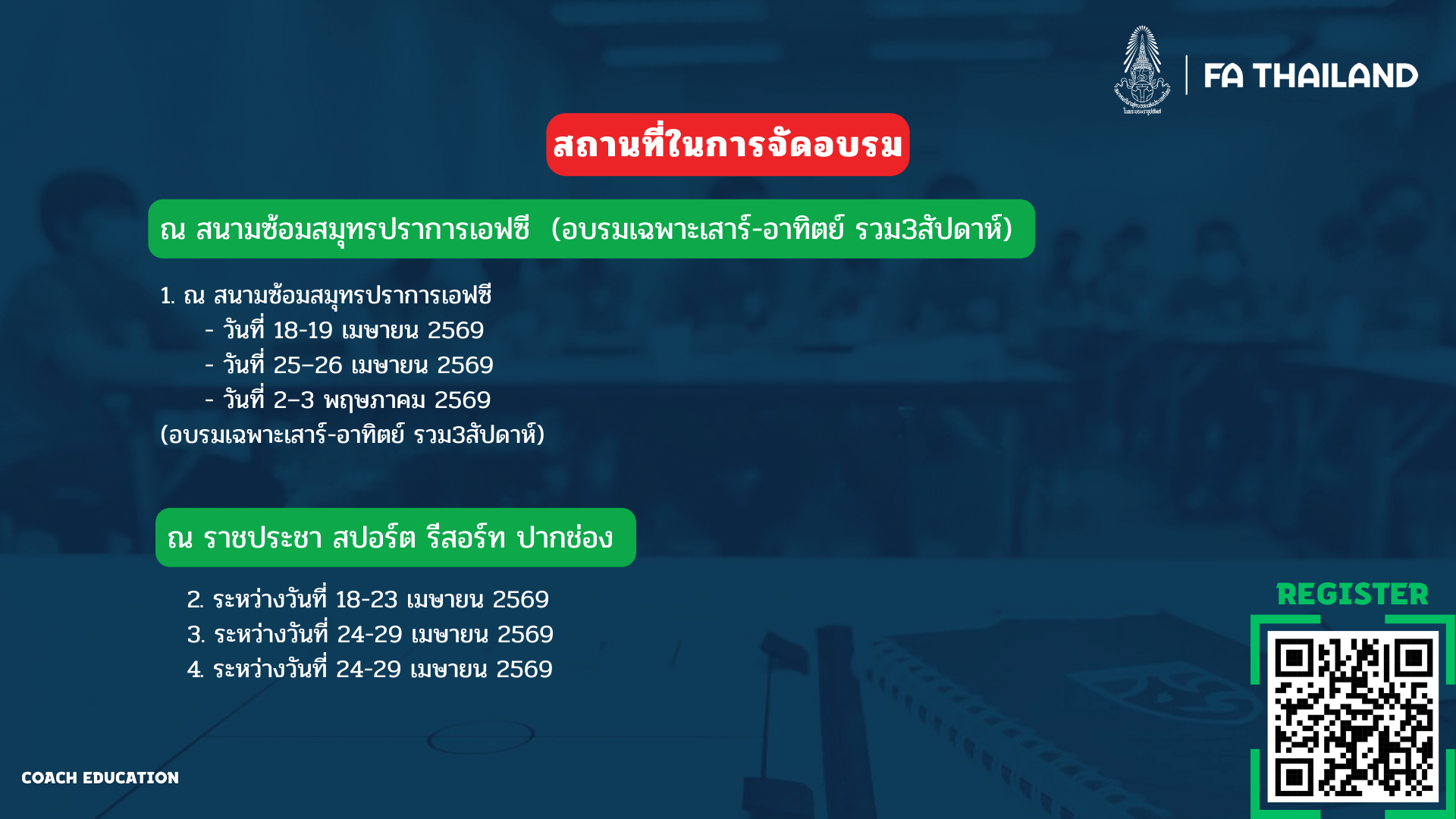 ประกาศ : ฝ่ายฝึกอบรม สมาคมฯ ร่วมกับ ชมรมเส้นทางสู่โค้ชฟุตบอลอาชีพ รับสมัครผู้เข้าร่วม "อบรมผู้ฝึกสอน" หลักสูตร FAT 'G' Diploma ประจำปี 2569